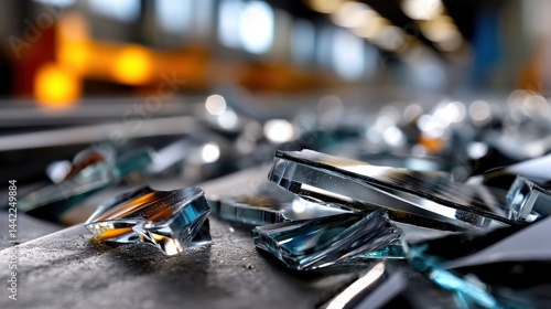 Fototapeta premium Crushed glass shards scattered on metallic surface with blurred industrial...