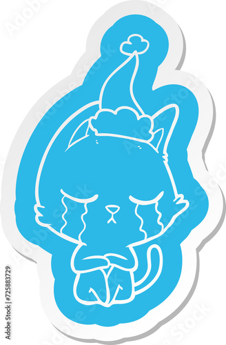 Fototapeta premium crying cartoon sticker of a cat sitting wearing santa hat