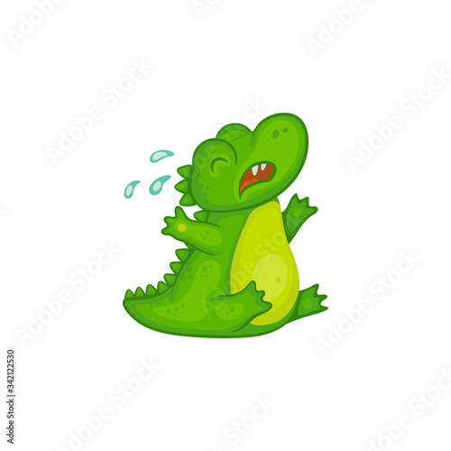 © sabelskaya, Naklejka premium Crying green cute baby crocodile cartoon character vector illustration isolated.