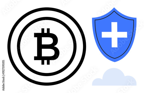 Fototapeta premium Cryptocurrency, blockchain technology, cybersecurity, financial safety, digital currency, cloud storage. Bitcoin symbol, security shield with cross and cloud icon. Cryptocurrency and blockchain