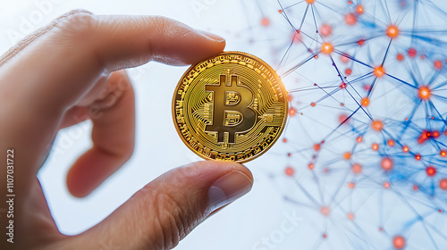 © Liliya, Fototapeta premium Cryptocurrency golden bitcoin coin in hand. Digital currency concept.