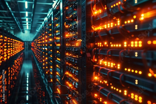 Obraz premium Cryptocurrency mining farm with rows of high-performance servers, illuminated...