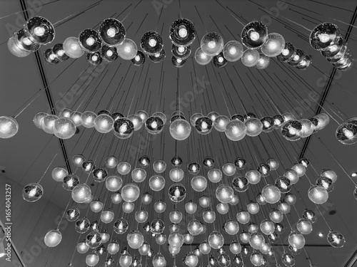 © Nirja, Obraz premium crystal chandelier hanging from a ceiling, black and white interior photography