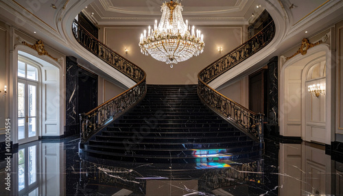 © Seckin Ozturk, Obraz premium Crystal Chandelier Reflected in Marble Staircase . Wedding Concept. Generated Image