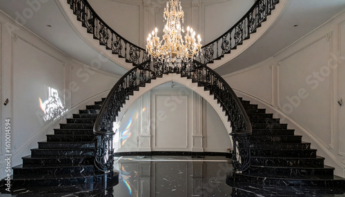 © Seckin Ozturk, Fototapeta premium Crystal Chandelier Reflected in Marble Staircase . Wedding Concept. Generated Image