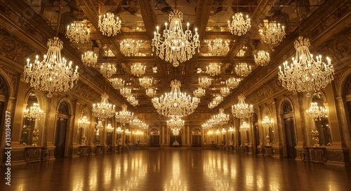 Obraz premium Crystal chandeliers illuminate grand ballroom's gilded ceiling