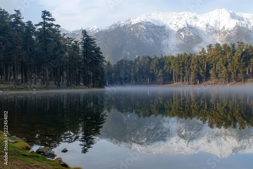 Fototapeta premium crystal clear alpine lake reflecting snow-capped peaks, surrounded by evergreen forest, morning mist rising from water