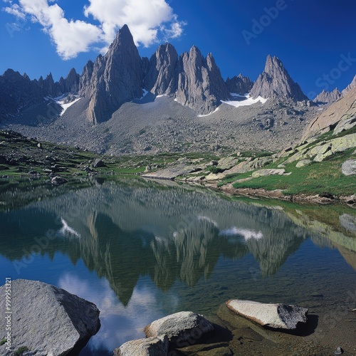 Naklejka premium Crystal-clear alpine lake surrounded by jagged mountain peaks, reflecting the...