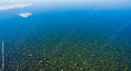 Fototapeta premium Crystal clear blue water reveals smooth pebbles on the lakebed under a bright...