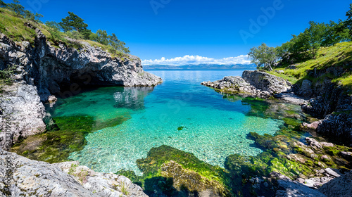 © BROPRADANA, Fototapeta premium Crystal-clear cove, lake view, summer, rocky shore, travel