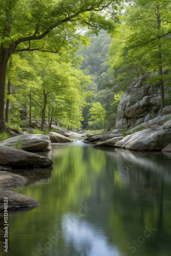 © Dragan, Naklejka premium crystal clear creek winding through lush forest sunlight filtering through leaves creating serene atmosphere