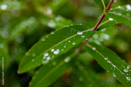 © River Ho, Obraz premium crystal clear dew drops are condensed on vibrant green leaves