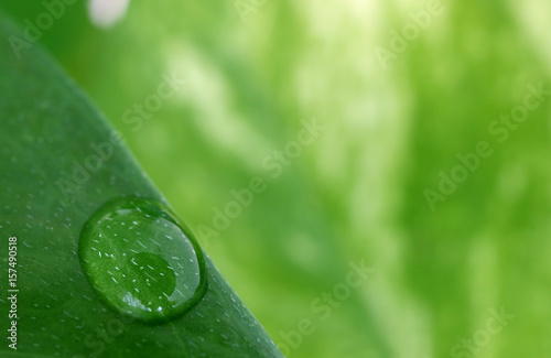 Fototapeta premium Crystal clear dewdrop on the green Leaf in soft sunlight, with selective...