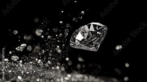© Bilkis Akter, Fototapeta premium Crystal clear Diamond float in mid air with glitter silver diamond dust explode. Black background