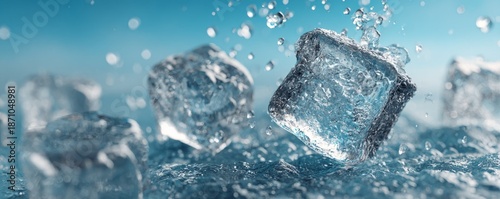 © Putra, Obraz premium Crystal Clear Ice Cubes Splashing in Water with Bubbles and Textures in Summer Scene
