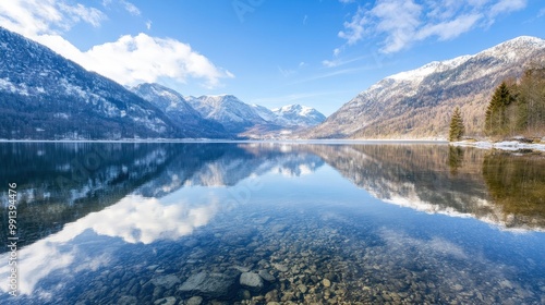 Fototapeta premium Crystal Clear Mountain Lake Reflecting Snowy Peaks