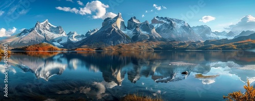 © Coosh448, Obraz premium Crystal-clear mountain lake reflecting the surrounding peaks, 4K hyperrealistic photo