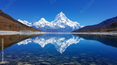 Naklejka premium Crystal clear mountain lake, towering snow-capped peaks reflected perfectly,...