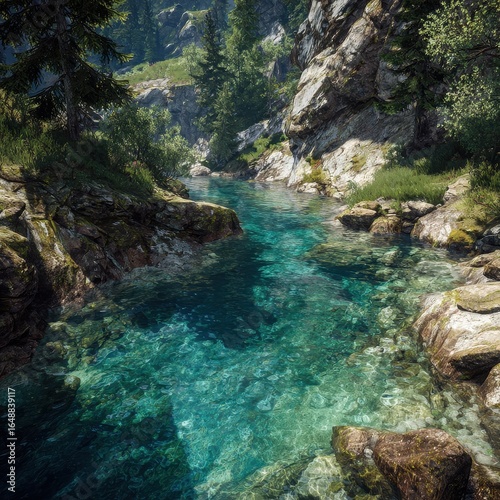 © Kopi, Fototapeta premium Crystal-clear mountain river flows through rocky gorge, sunny day, lush greenery background; nature travel scene