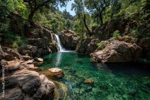 Fototapeta premium Crystal-clear pool at a cascading waterfall, nestled beneath lush forest
