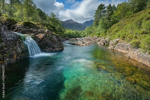 Fototapeta premium Crystal-clear river flows through rocky terrain, cascading into a serene pool...
