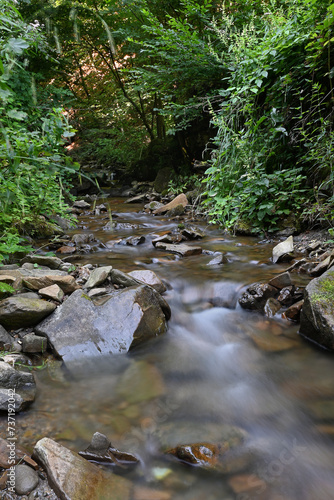 © Mykola, Fototapeta premium Crystal clear river originates in the mountain forest.