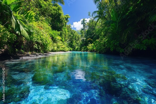 © lana_art, Naklejka premium Crystal clear river surrounded by lush green vegetation under a bright blue sky