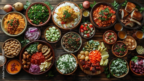 Fototapeta premium Crystal-clear shot of a vibrant Mediterranean mezze spread, various dishes, rustic table,