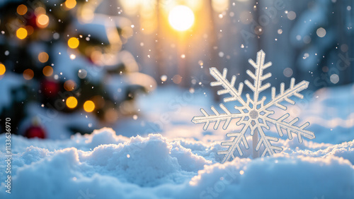 © cyishu, Naklejka premium Crystal Clear Snowflake on Snowy Ground with Christmas Decorations in the Background under Sunlight