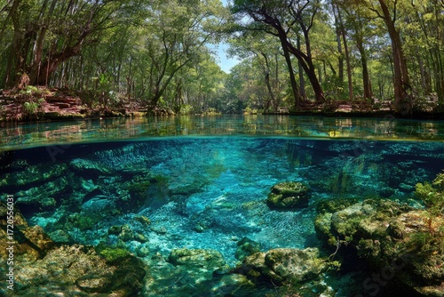 © ceradan, Fototapeta premium Crystal-clear spring river, lush forest canopy above