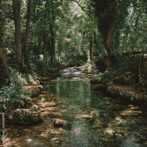 © Divapali, Obraz premium Crystal-clear stream flows through lush forest