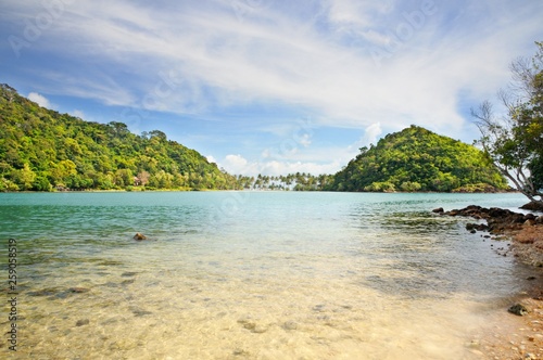 Obraz premium Crystal clear tropical sea with island covered with rainforest on horizon at...