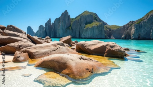 © Sanook, Fototapeta premium Crystal-clear turquoise water laps smooth rocks on a pristine beach, dramatic cliffs in the distance, beach, seascape