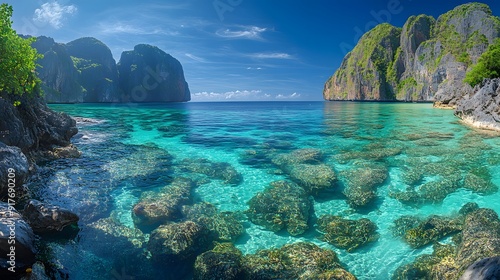 © Chatupat, Fototapeta premium Crystal Clear Water and Lush Green Cliffs in a Tropical Lagoon. generative ai illustration.