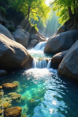 © Kraengkrai, Naklejka premium Crystal-clear water cascading over smooth rocks, sunlight illuminating its purity A tranquil scene of natural beauty, perfect for relaxation and wellness themes , vibrant, natural, mountain