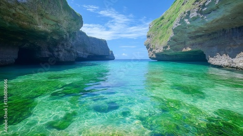 Fototapeta premium Crystal clear water flowing between two rocky cliffs creating a natural...