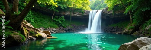 Fototapeta premium Crystal clear water plunges into emerald pool, surrounded by ancient trees , clean, leaves