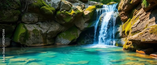 © Pimchada, Fototapeta premium Crystal-clear waterfall cascading over moss-covered rocks into a pristine pool, flow, landscape
