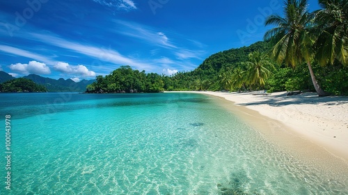 Fototapeta premium Crystal clear waters and sandy beaches in a tropical paradise under a sunny sky, inviting relaxation and exploration in nature's beauty
