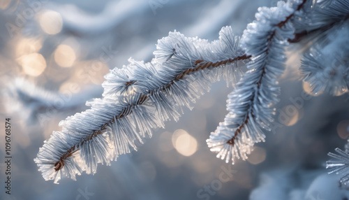 Obraz premium Crystal-Covered Pine Branches in Winter Glow