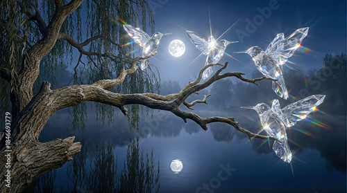 Naklejka premium Crystal Hummingbirds on Tree Branch over Moonlit Lake Fantasy Night Scene