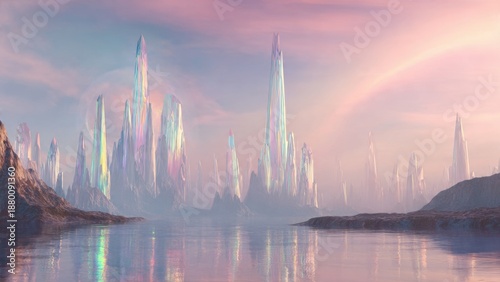 © darshika, Fototapeta premium Crystal towers over serene lake at dawn.