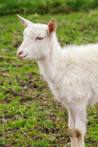 © lapis2380, Obraz premium Cub of a white goat on a green lawn.