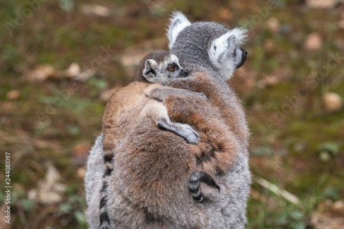 Fototapeta premium Cub on the back of an adult female ring-tailed lemur, rear view