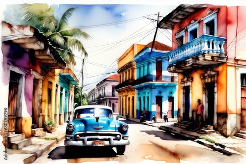 Fototapeta premium Cuba com seus carros antigos e casa coloridas, (gerado com ia)