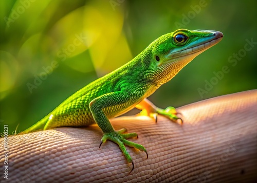 © Manatsavee, Obraz premium Cuban Anole Close-Up: Tiny Lizard Ascending Ankle