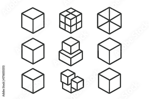 © Ciara, Fototapeta premium Cube line icon collection. Set of 3D geometric box shapes. Abstract block and square symbols for logo, data, or technology concepts. Minimalist isometric vector signs.