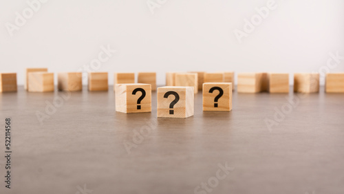 © Maks_Lab, Obraz premium cube with question mark on wooden background. space for text