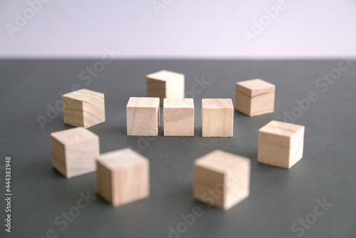 © sinseeho, Obraz premium Cube wood blocks on table. Copy space.