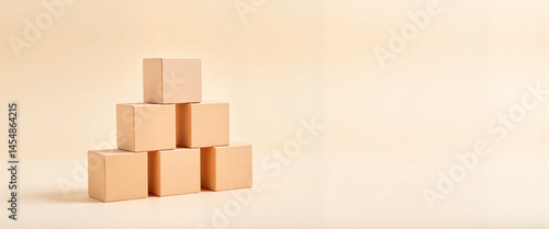 © Anastasiya, Obraz premium Cubes forming a pyramid structure on soft neutral backdrop, creativity